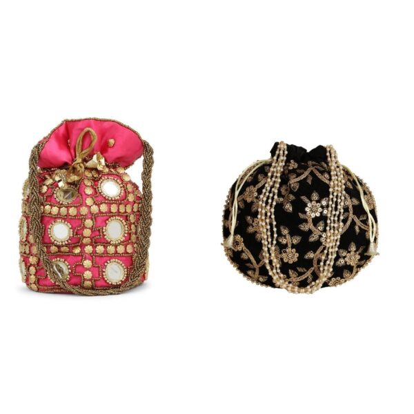 This product is a combo of tow Embellished potli bags having wrist loop 1 main compartment each with drawstring closure.