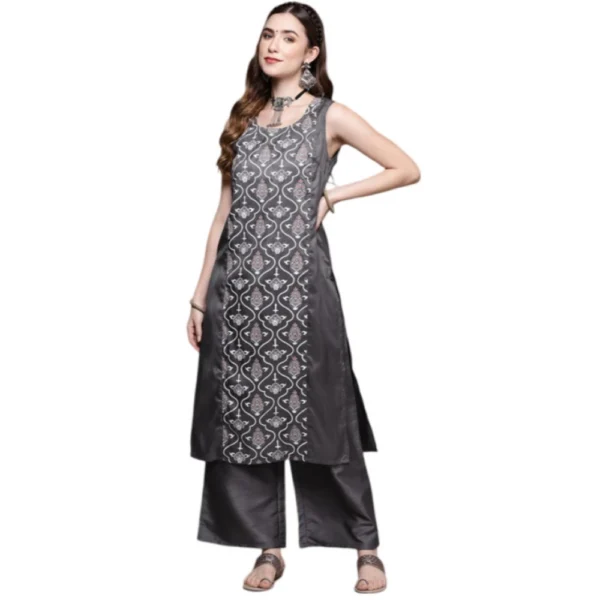 Women’s Casual Sleeveless Floral Printed Poly Silk Kurti and Palazzo Set (Dark Grey)