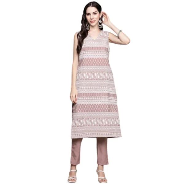 Women’s Casual Sleeveless Foil Printed Crepe Kurti and Pant Set (Pink)