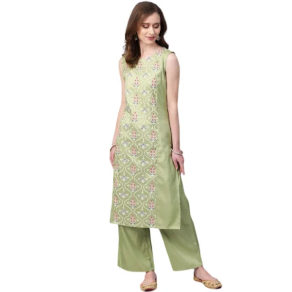 Women’s Casual Sleeveless Floral Printed Poly Silk Kurti and Palazzo Set (Green)