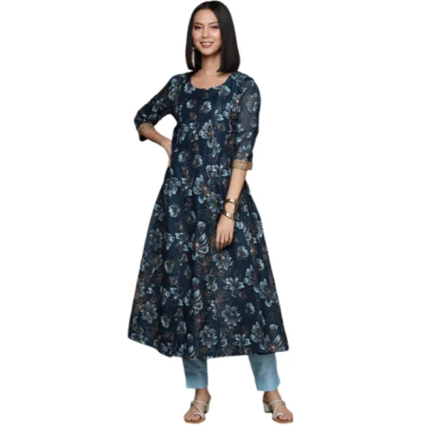 Women’s Casual 3-4Th Sleeve Floral Printed Chanderi Cotton Kurti And Pant Set (Navy Blue)