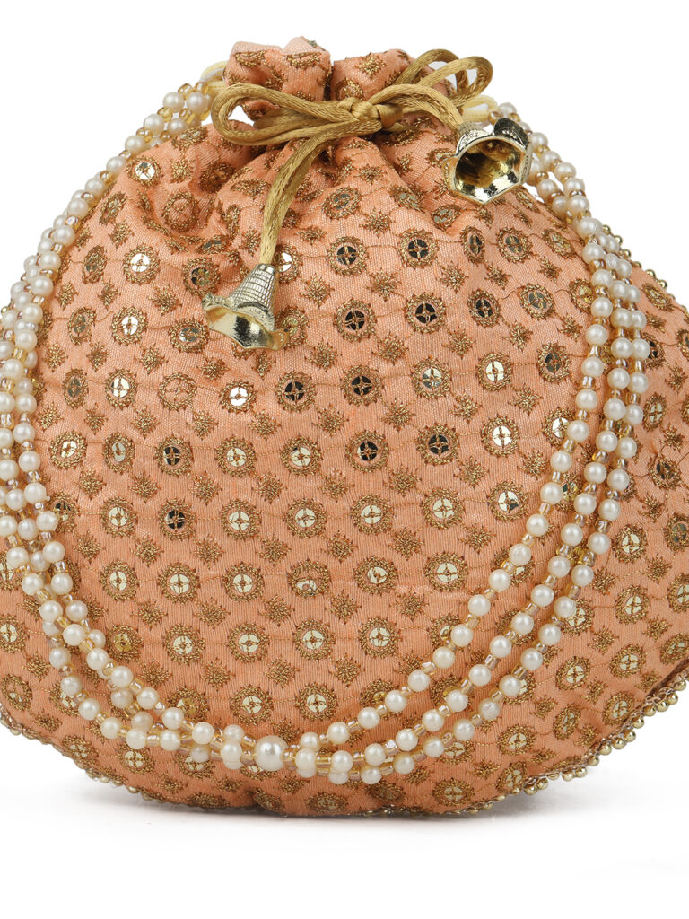 Beige embellished potli Has wrist loop 1 main compartment with drawstring closure Size & Fit Size : 9 x 9