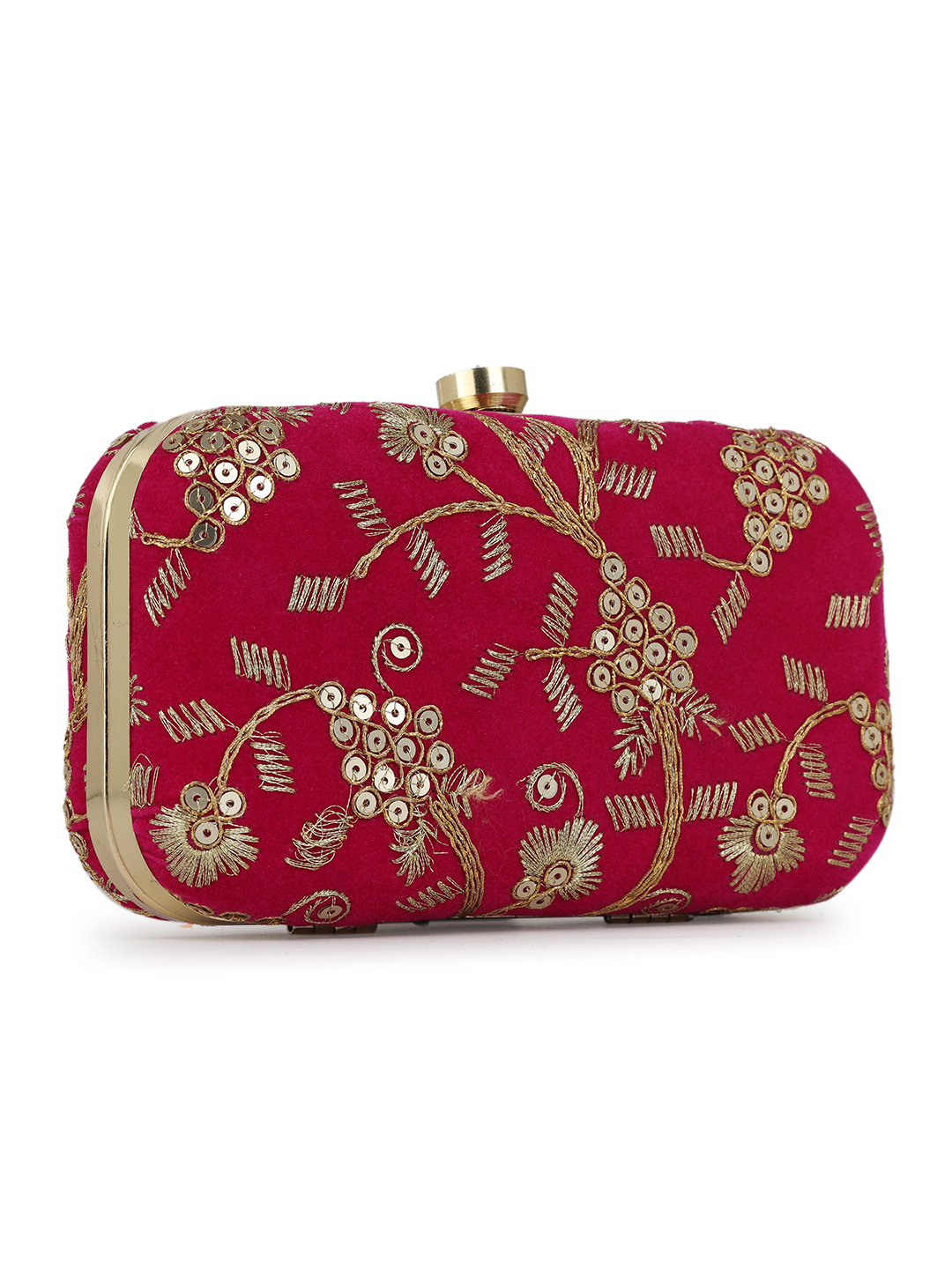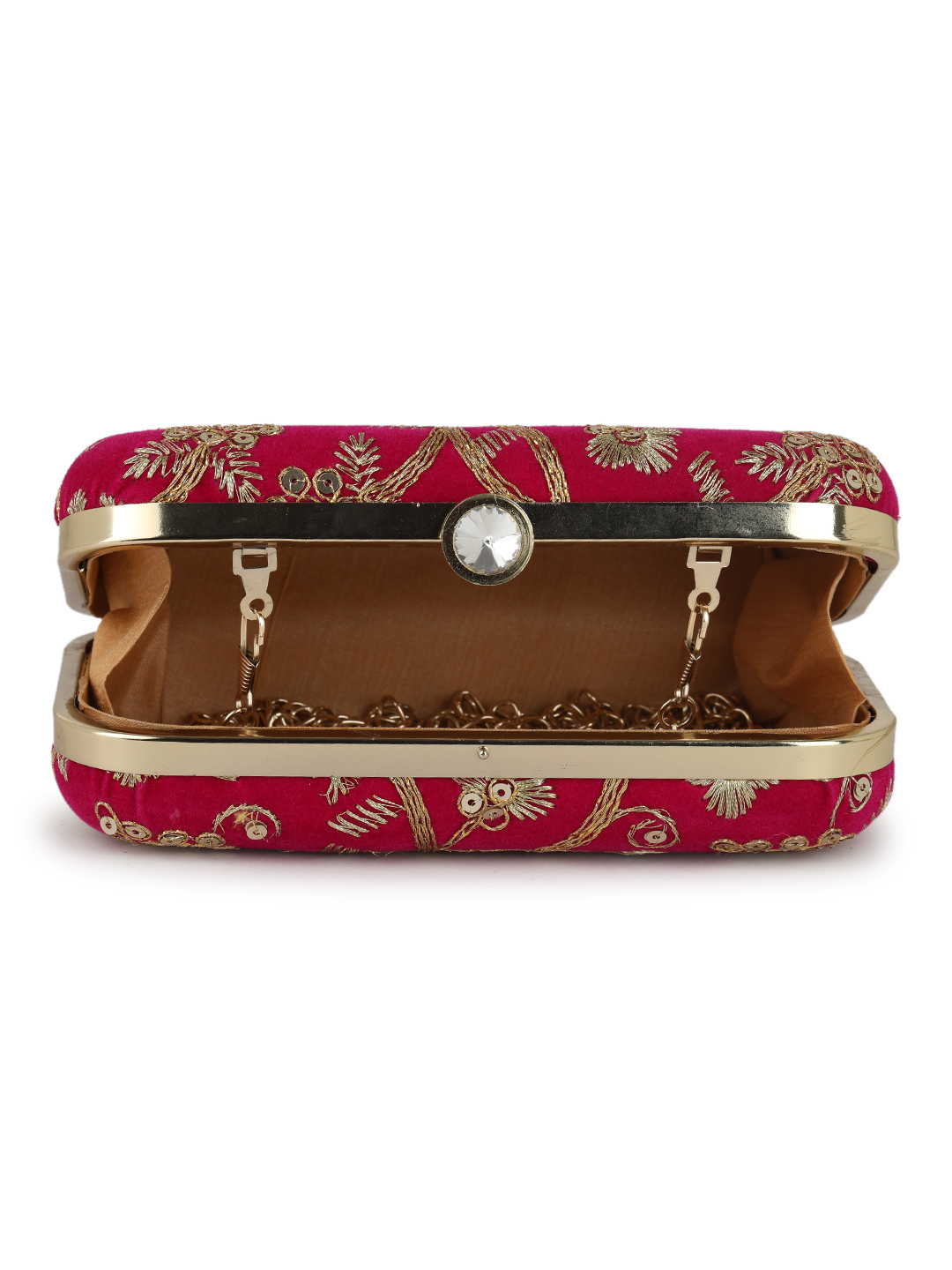 Pink Embroidered Box clutches, Has gold chain shoulder strap, 1 main compartment with twist closure