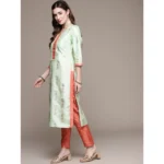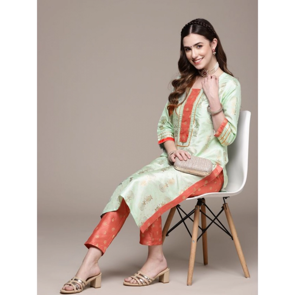 Women’s Casual 3-4Th Sleeve Floral Printed Poly Silk Kurti And Pant Set (Pista Green)