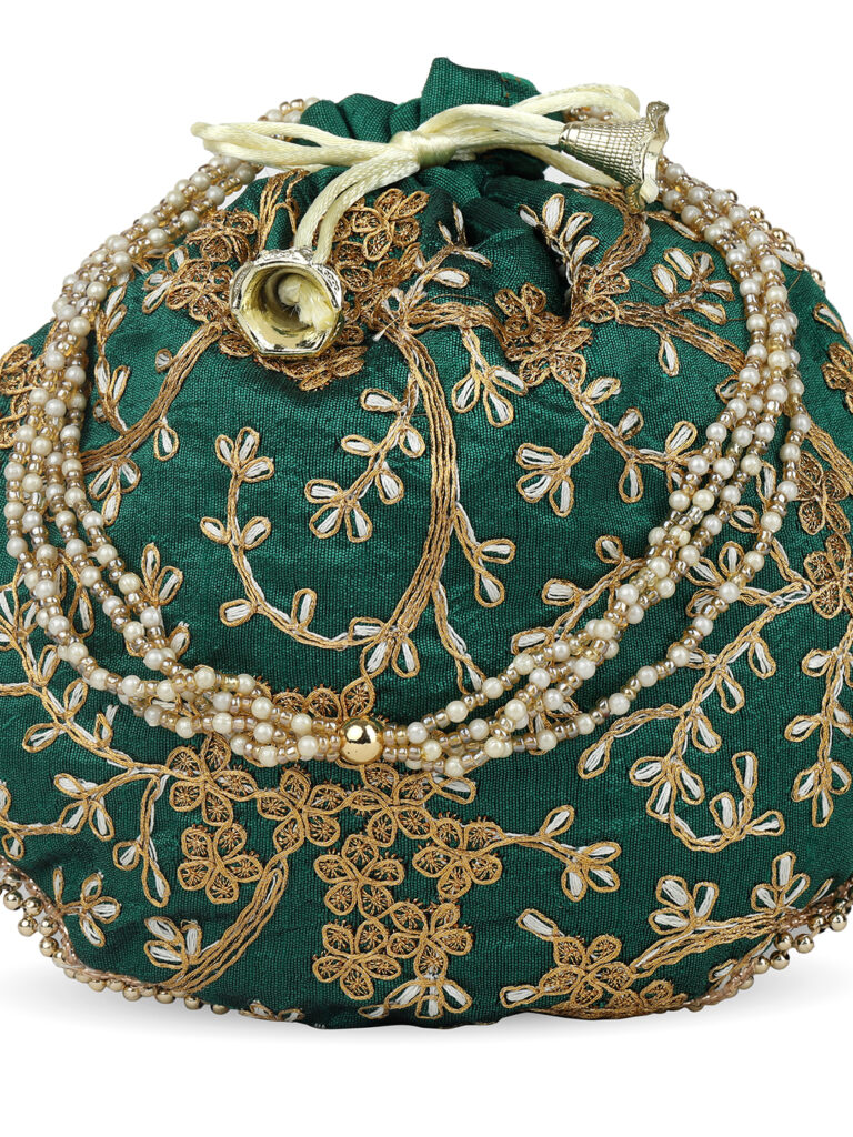White & Gold-toned embellished potli Has wrist loop 1 main compartment with drawstring closure Size & Fit Size : 9 x 9 x 3 Inch (Length x Width x Depth ) Material & Care Fabric Wipe with clean, dry cloth