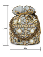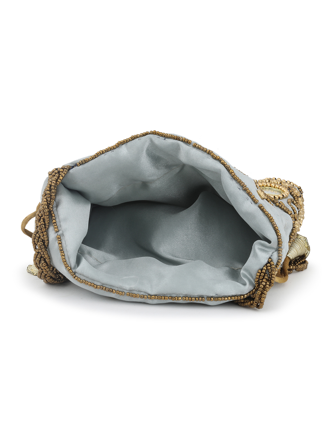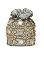 White & Gold-toned embellished potli Has wrist loop 1 main compartment with drawstring closure Size & Fit Size : 9 x 9 x 3 Inch (Length x Width x Depth ) Material & Care Fabric Wipe with clean, dry cloth
