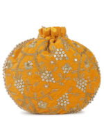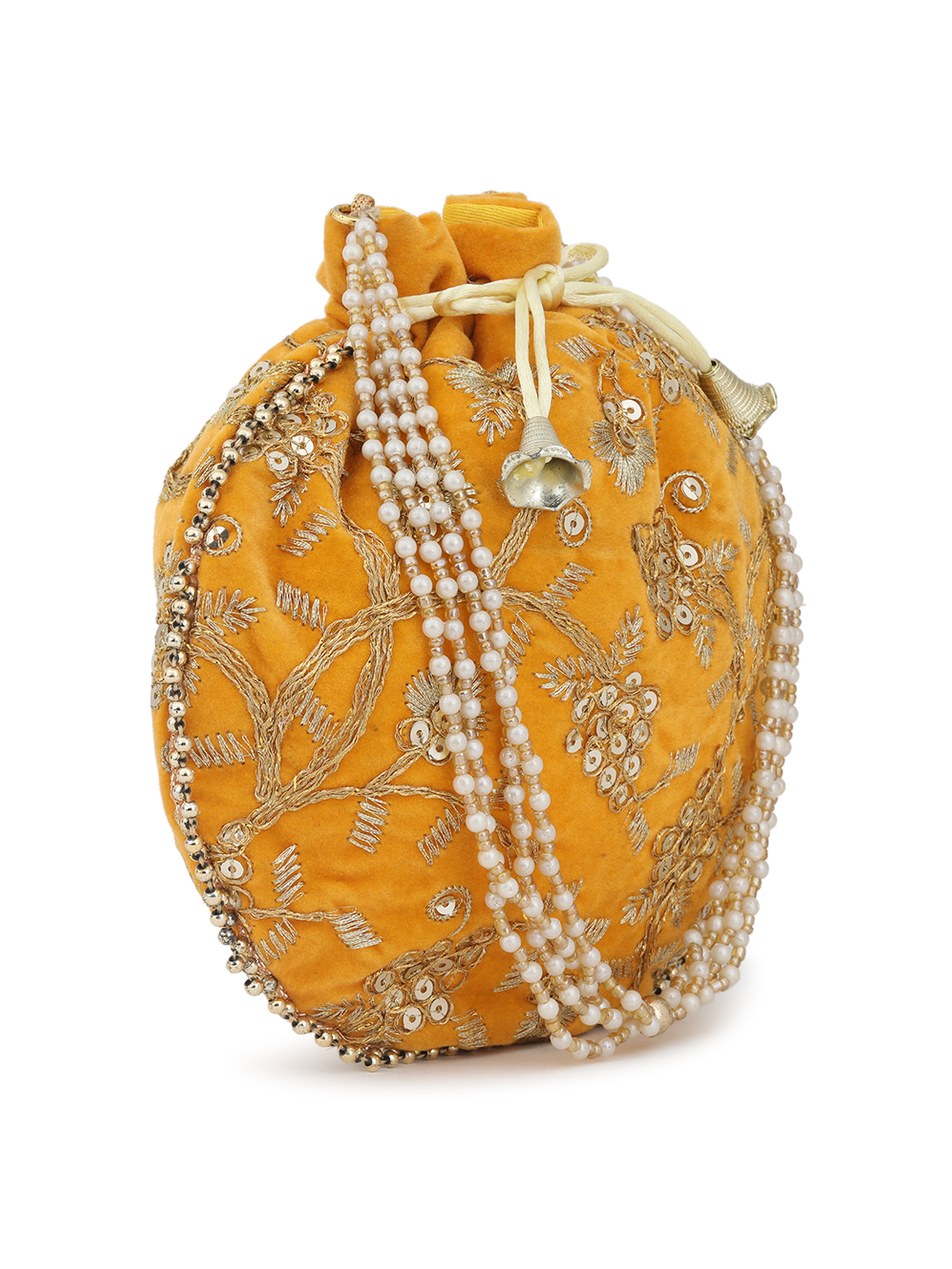 Yellow embroidered potli clutches Has wrist loop 1 main compartment with drawstring closure Size & Fit Height: 9 cm Width: 3 cm Depth: 9 cm Material & Care Fabric Wipe with a clean, dry cloth when needed